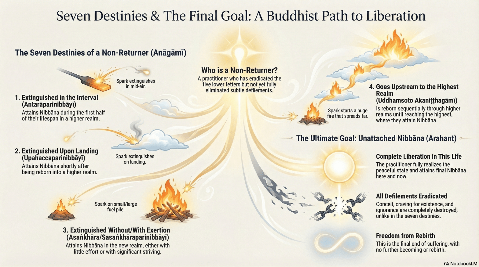 | Upahaccaparinibbāyī | Attains Nibbāna immediately after rebirth. | The spark goes out the moment it touches the ground. |