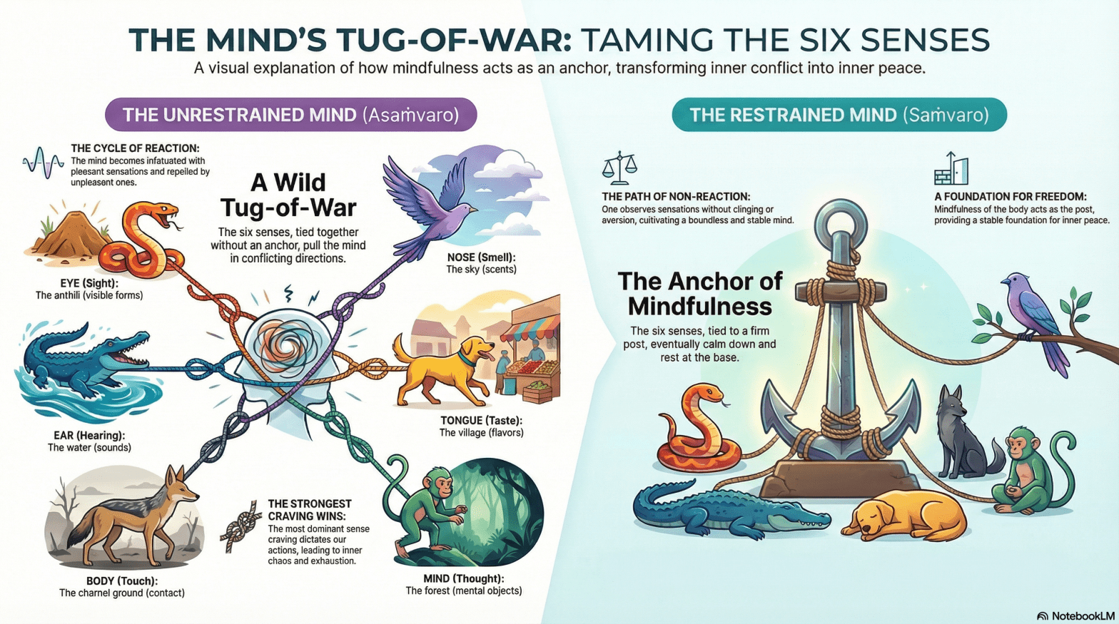 Chappāṇakopamasutta: This sutta teaches us on how to conduct sense restraint since each one of these senses would go in search of objects which makes no sense as far as nibbana goes. The moment the senses are going here and there, one cannot be happy as the experience fades away wanting the same thing toContinue reading “Profound simile of six animals”
